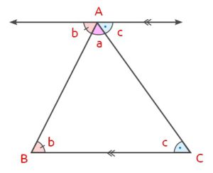 Bu ifadenin doğruluğunu göstermek için A köşesinden [BC] kenarına paralel çizilir. a açısına komşu olan açılar, iç ters açılardan dolayı, b ve c’dir. Bu şekilde a, b ve c doğru açı oluşturur ve toplamları 180 derece olur.