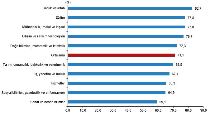Lisans mezuniyet alanları göz önüne alındığında, kayıtlı istihdam oranının en yüksek olduğu ilk beş eğitim ve öğretim alanı; sağlık ve refah (%82,7), eğitim (%77,8), mühendislik, imalat ve inşaat (%77,8), bilişim ve iletişim teknolojileri (%76,7) ile doğa bilimleri, matematik ve istatistik (%72,3) olarak gerçekleşti.
